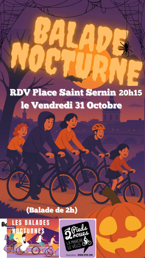 RDV 20h15 à Saint Sernin pour le briefing et ensuite départ. Venez décorés dans le thème Halloween à vélos éclairés.