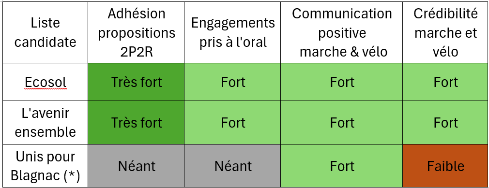 (*) Pour "Unis pour Blagnac", en l’absence de réponse à nos propositions et questionnaire et en l’absence de rencontre avec les représentants de la liste, l’évaluation se limite à l’analyse du programme et des divers supports de communication de la liste.